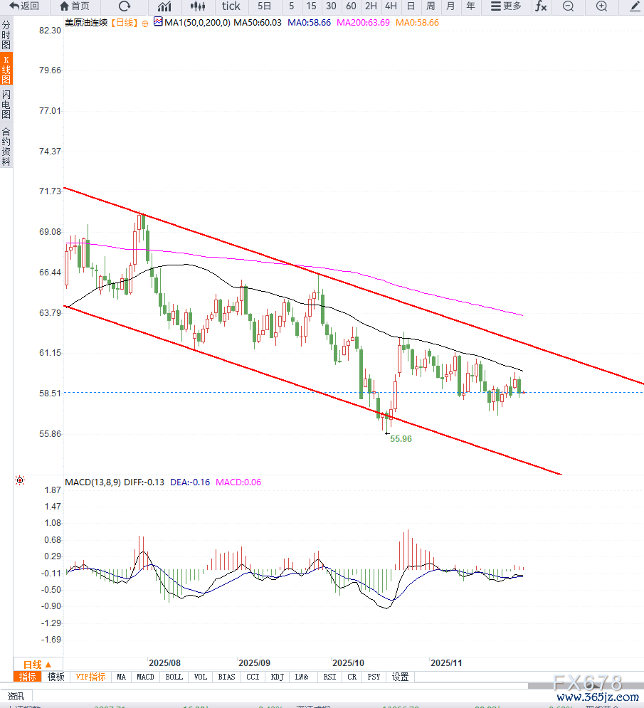 从WTI日线图走势来看,油价在跌破60好意思元关隘后已解析跌穿短期均线撑握区,并涉及近一个月震憾平台的下缘位置。近期汇集阴线流露空头力量主导行情,MACD动能柱握续扩大在零轴下方,响应趋势延续缺陷。